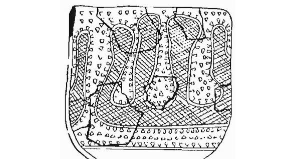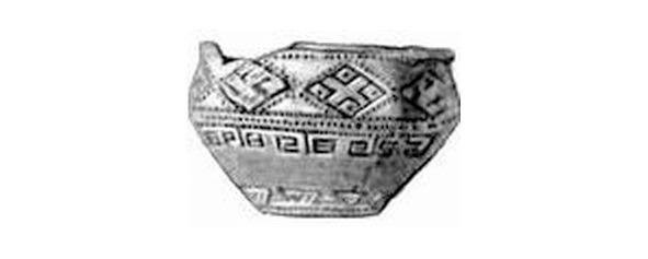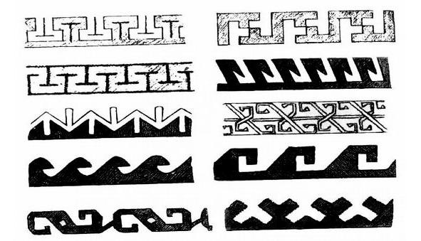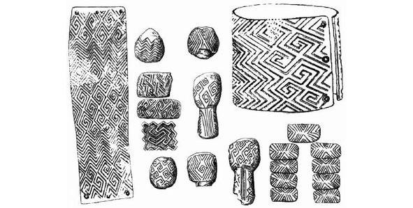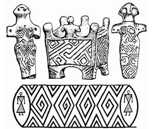 This ornamental differentiation becomes even more evident in the Neolithic. So a large number of different variants of ornaments based on the rhombo-meander Paleolithic composition give us Neolithic “seals” (on which one can find rows of S-shaped meander elements — “jibs”, and meander stripes, and swastika elements) and Neolithic clay statuettes depicting women, covered with all sorts of meander composition motifs. B. A. Rybakov notes that if the meander pattern was widely used in the Neolithic for ornamentation of ceramics in general, then “for ritual dishes and plastics, it was almost mandatory”.