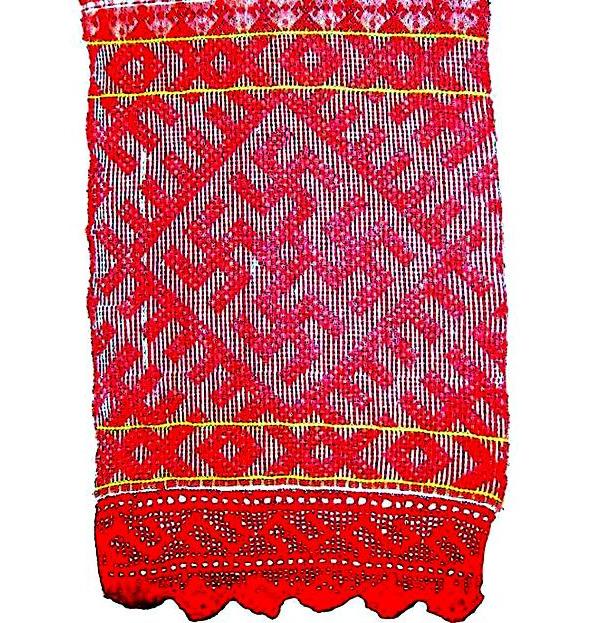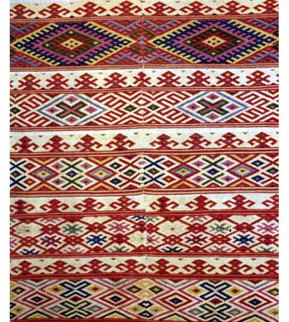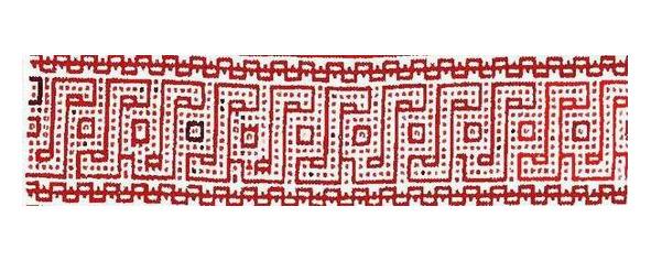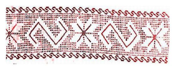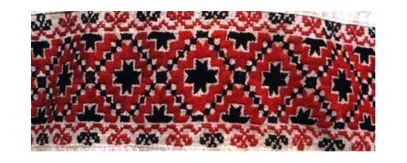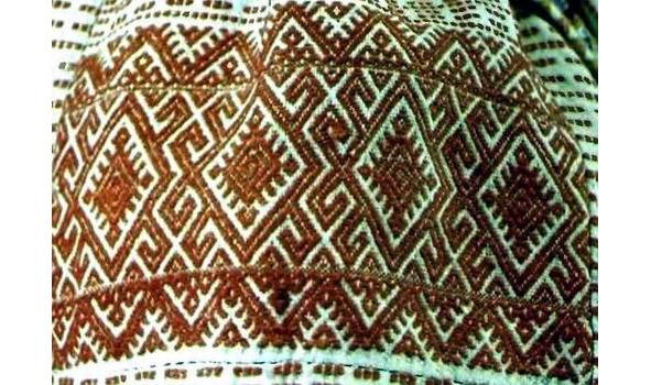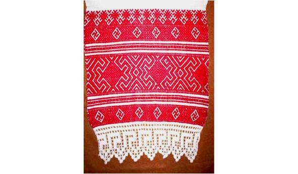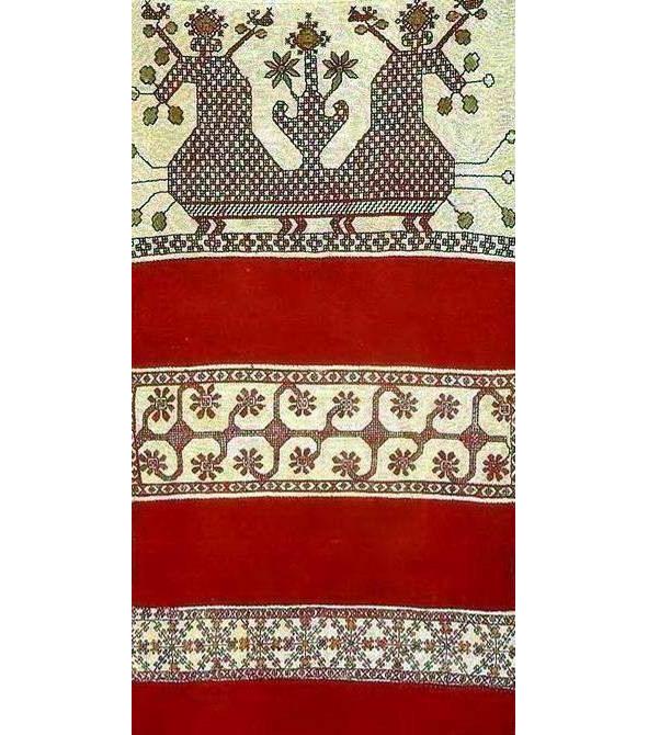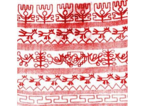 With the development of weaving techniques, the ancient craftswomen of the Neolithic or Eneolithic were able to transfer complex ornaments from rhombuses and meanders directly into the structure of the fabric. Such an ancient carpet-type ornament, almost identical to the Mezin and Early Neolithic, can be easily found on linen canvases that existed in North Russian villages at the beginning of the 20th century. Made in a multi-thread technique, they are all completely covered with a rhombo-meander pattern, obtained with a complex interweaving of warp and weft threads. As a rule, towels, tablecloths, skirts were made of such canvas, to which strips of spacers were sewn, recruited with red threads along a white field. The ornament of these spacers is often very similar to the ancient rhombo-meander, but while the texture of the white canvas repeats the ancient compositions with practically no changes, on the spacers we see, as it were, fragments of an archaic scheme, its parts divided and grouped according to some new principles.