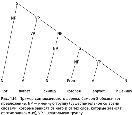По мнению авторов, язык — это прежде всего грамматика, а грамматика — это прежде всего синтаксис, синтаксис же, в свою очередь, — это прежде всего способность к рекурсии91, т.е. возможность вставления одних составляющих в другие составляющие того же типа — именной группы внутрь именной группы, предложения внутрь предложения. Составляющая может быть вставлена в середину другой (как в эксперименте, описываемом в статье) или в конец, как, например, в известном английском стихотворении про дом, который построил Джек: «Вот кот, // Который пугает и ловит синицу, // Которая часто ворует пшеницу, // Которая в темном чулане хранится // В доме, // Который построил Джек»92. Здесь предложения про Джека и его дом, про пшеницу, про синицу и про кота вставлены одно в другое, как матрешки.