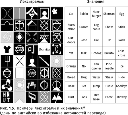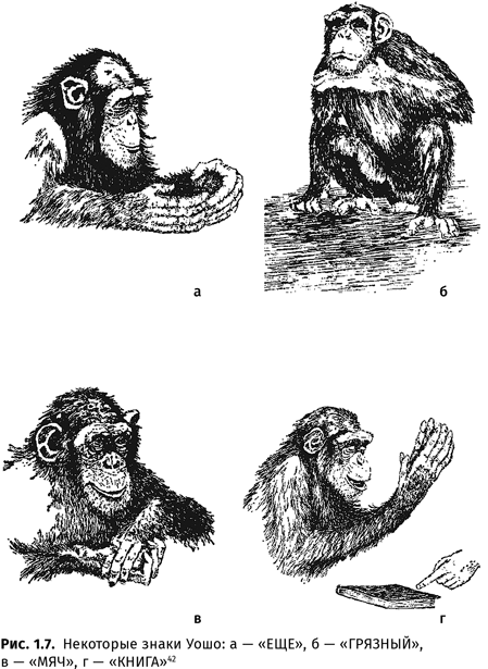 Но значит ли это, что обезьяны овладели человеческим языком? Очевидно, нет. Один из участников эксперимента с Уошо — глухой, для которого амслен был родным языком, — отмечал, что слышащие люди «все время видели больше жестов, чем я… Может быть, я что-то пропустил, но я так не думаю. Я просто не видел никаких жестов»52. Почему же так произошло? Ведь жесты Уошо тоже выдерживали проверку двойным слепым контролем. Можно предположить, что причин этому две. Первая состоит в том, что «по оценкам специалистов, жестовая речь обезьян соответствовала скорее „лепету“ двухлетних глухонемых детей, чем языку взрослых»53. Поэтому понять их жесты постороннему человеку, вероятно, так же трудно, как догадаться, что, например, произнесенное незнакомым малышом пихо означает ‘подземный переход’. Вторая причина — в том, что Уошо не соблюдала грамматику амслена (отчасти потому, что ее этому просто не учили).