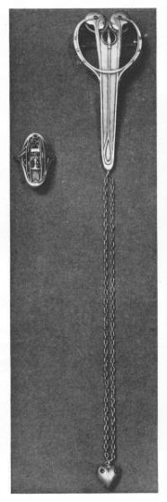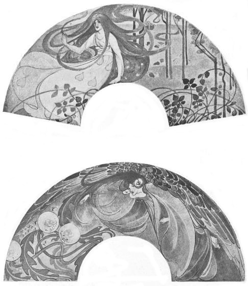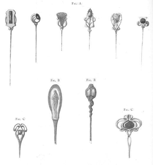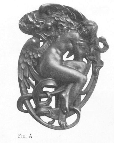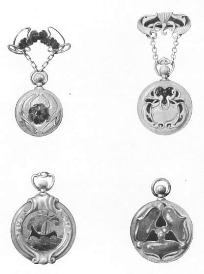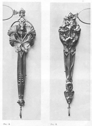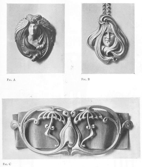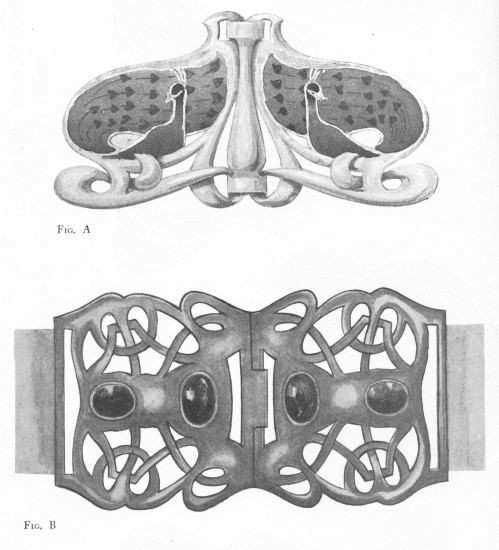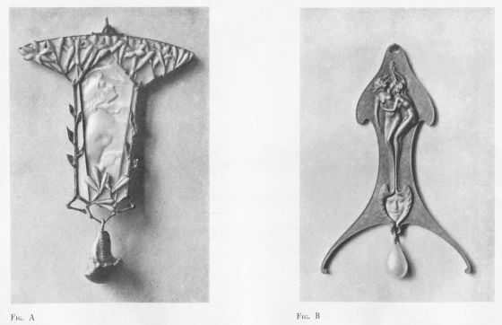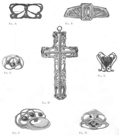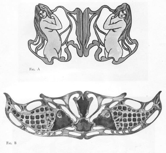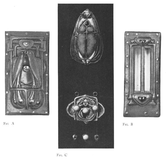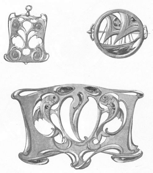 Erick Magnussen is a very young artist, who seems to give promise. The "1901" in the pendant mirror is very deftly drawn, covering its space evenly and well, as does also the design of the "Fish" clasp illustrated. The other, with the mermaids, shows that he can also successfully employ the female form for decorative purposes.