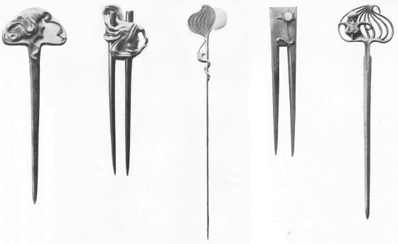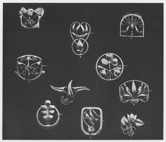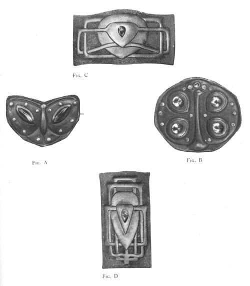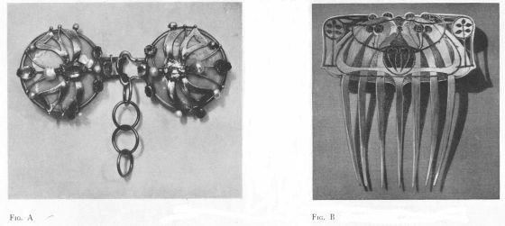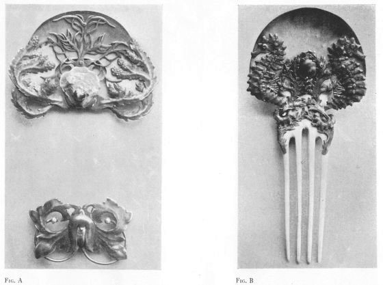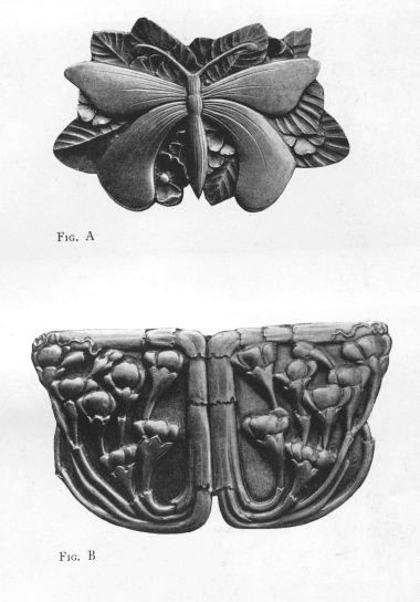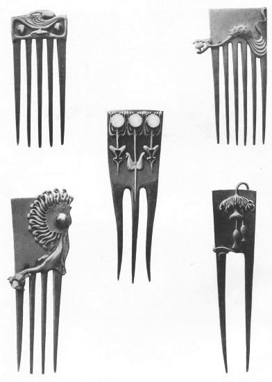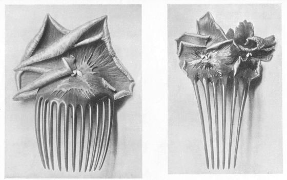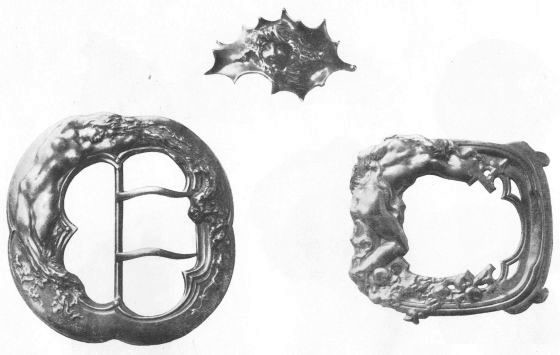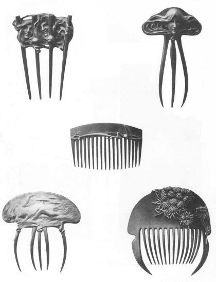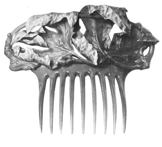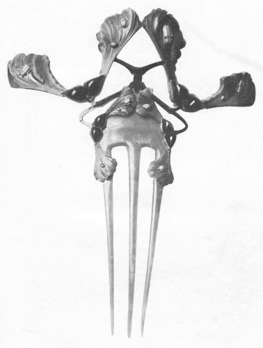 Moyens Bollin, who has lately gone in for the making of artistic metal objects, has also designed several pretty combs, clasps, etc., made in silver or bronze. In the former material is a clasp, of which we give an illustration, with flowers in blossom and bud, admirably drawn so as to fill their allotted space. Another clasp, a butterfly, is in bronze.