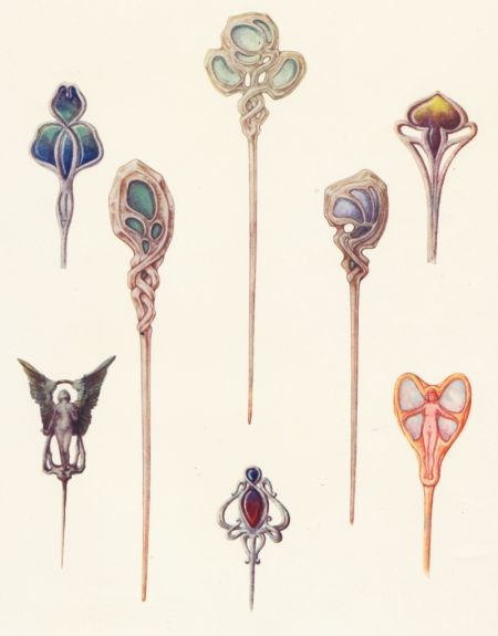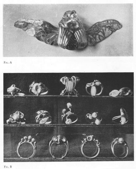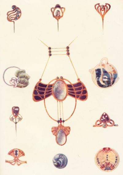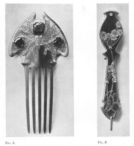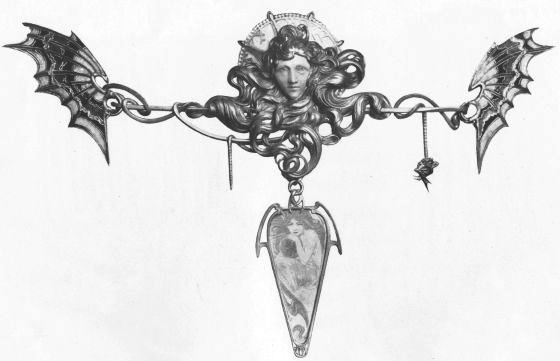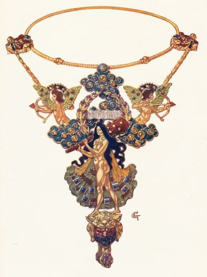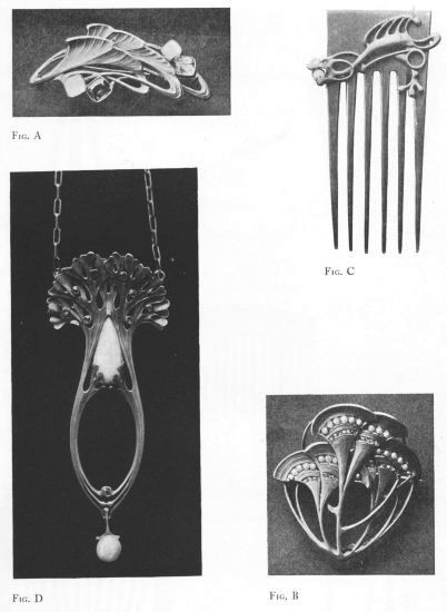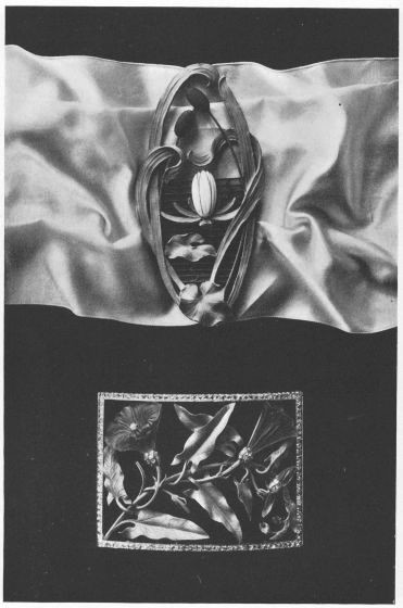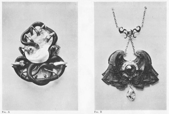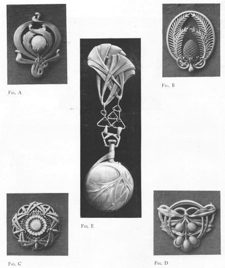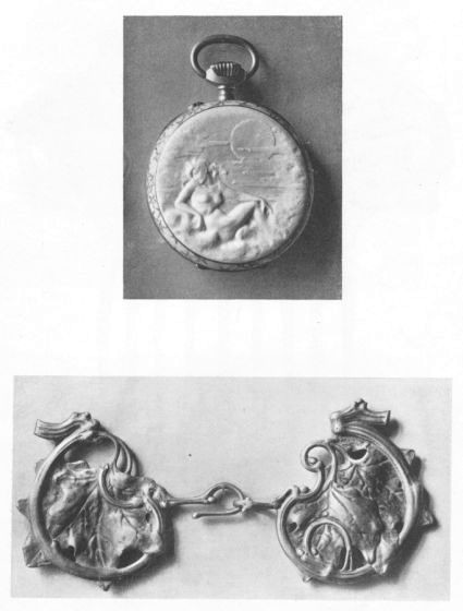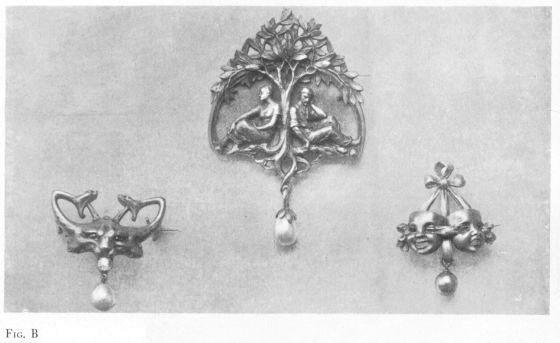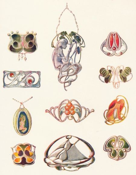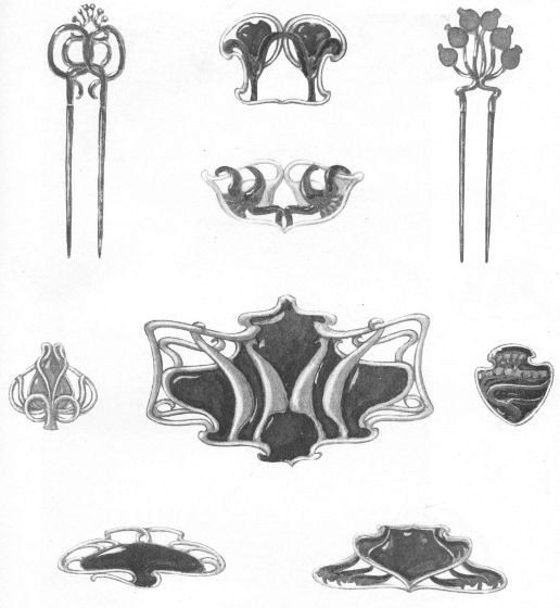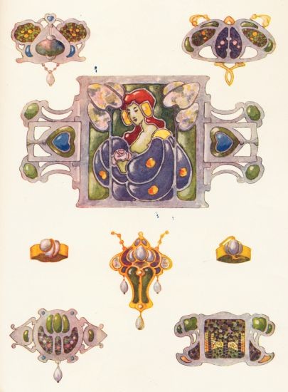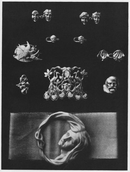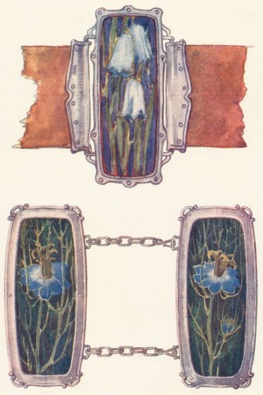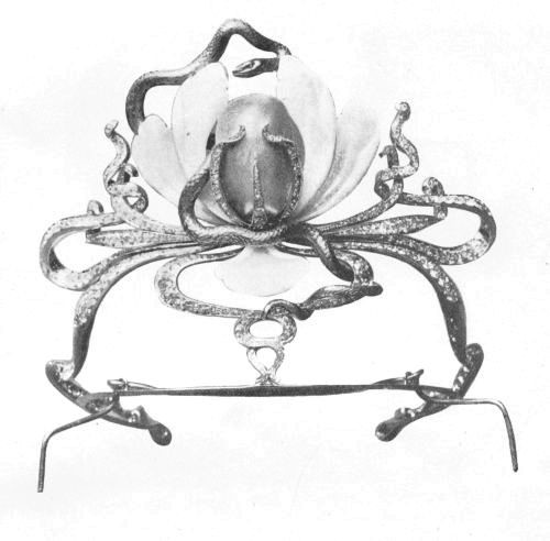 "I am of opinion that the jewel can be produced without the aid of stones, enamels, etc. I do not exclude them entirely, but they should not be used unless it be to give the finishing touch, or occasionally to relieve an ensemble lacking in vigour of colour. My preference is for oxydations, for in general effect they are more harmonious to the eye, and by careful seeking one can find all the tones required. I think you will share my opinion that it is much easier to use enamels, by means of which one's object is instantly attained. Yet it is seldom one produces a beautiful symphony of colour. Enamel can only be employed in small quantities. Why? Because, in the first place, he who uses it must have a profound knowledge of colours and a special colourist's eye; he must remember, moreover, that he is appealing to a clientèle composed principally of ladies, who in most cases regard the jewel simply as a means to complete such and such a toilette.