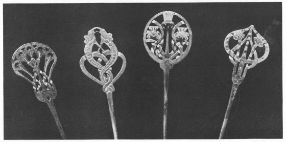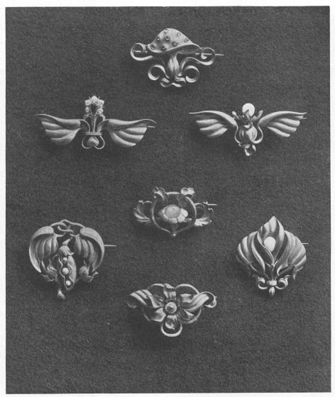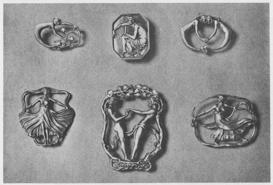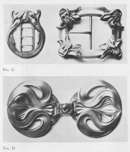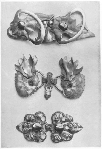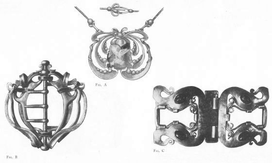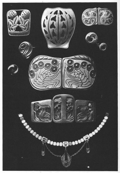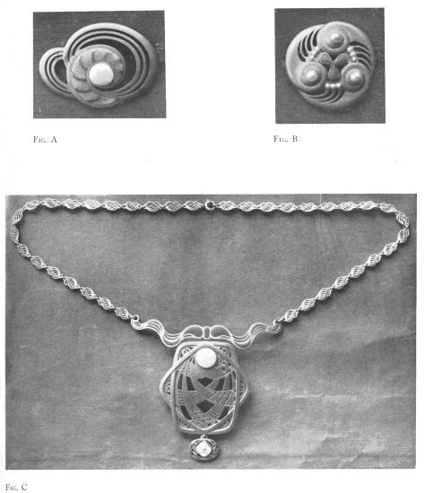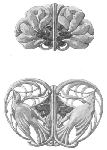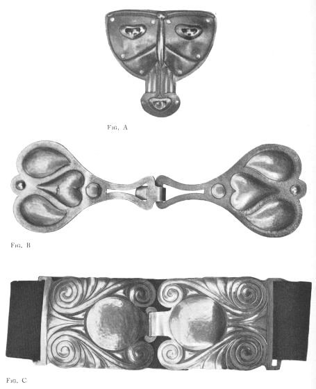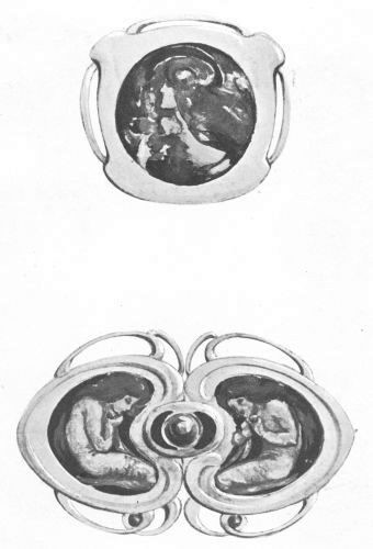 A silver clasp and brooch by Niels Dyrlund are distinguished by a quaint but well balanced intertwining of lines, the effect produced being pleasing and decorative, and Einar Nielsen, the talented painter, Axel Hou, and Georg Jensen have also recently taken to the designing of clasps and such like objects.