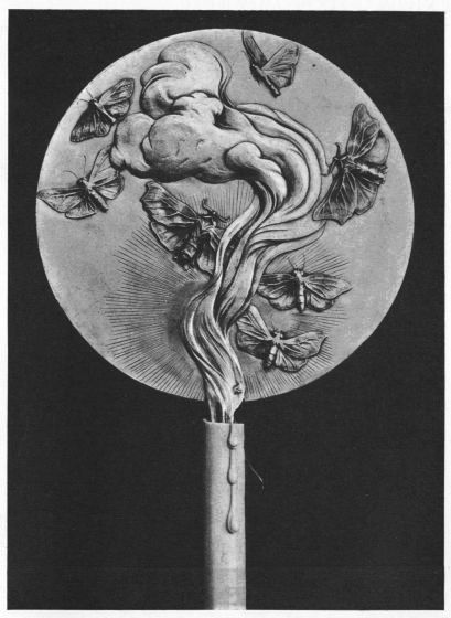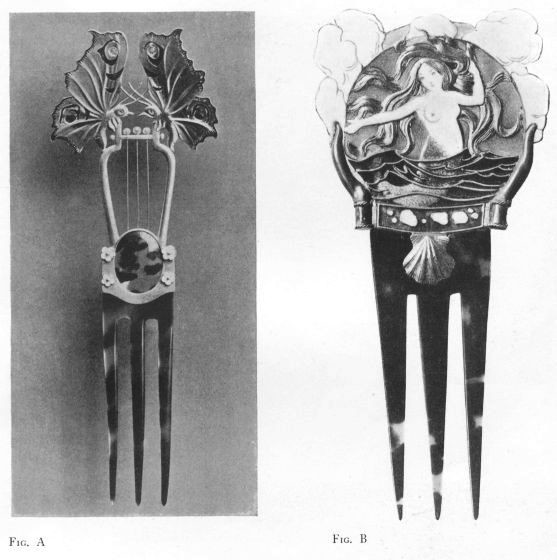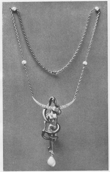 Of a totally different stamp is Harald Slott-Möller, to whom is due the place of honour when dealing with modern Danish jewellery. His designs are carefully conceived and they almost invariably illustrate a fine poetic idea or allegory, always happily chosen. They are somewhat elaborate, both in details and drawing, and in the choice of material, with regard to which he is rather extravagant than otherwise. His jewellery is possessed of a distinguished decorative beauty, and although he is entirely original, both in his choice of motifs and in his way of dealing with them, it might perhaps not be very difficult to trace certain English influences in his work. He is himself a skilful craftsman, whilst some of his designs have been executed at the famous establishment of Mr. Michelsen, Danish Court jeweller. For one of Mr. Michelsen's daughters, Slott-Möller designed the exceedingly beautiful brooch of which we give an illustration (Plate 4). It is made of silver, which is strongly oxidised, with blue, white, and green enamel. The stars are set in diamonds, and the pendants at the side are pearls. The comb with the butterflies on the lyre is the property of another sister, and is made of tortoise-shell and gold, with enamel, set with pearls, diamonds, and sapphires. A second comb, likewise made of tortoise-shell, has for its decorative motif a mermaid, gold, enamel, and coral being used with no mean skill. In the necklace the myth of Helen is represented. The central portion is of dark oxidised silver, with flames and sparks in gold, the walls of burning Troy and the grass are enamel, and the figure of Helen is carved in ivory. On the side plates men fight and die, illustrating the inscription, in Greek: "She brought devastation, she gave fame." Slott-Möller has himself made the whole of this elaborate and charming necklace. The hand-mirror is made in silver, with an ivory handle, in the likeness of a candle, round the flame of which a number of luckless moths flutter; the moths and the ooze from the candle are oxidised.