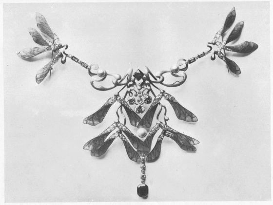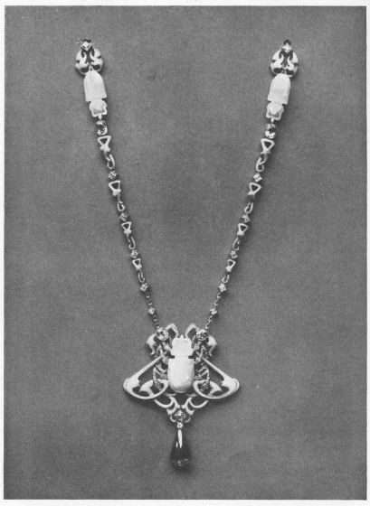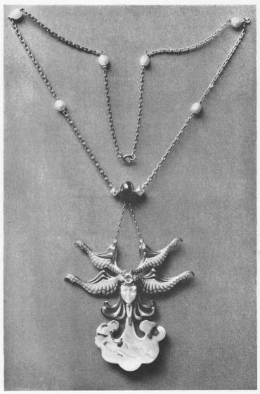 "M. Wolfers seeks his inspiration in the study of the nature and the forms of his marvellous domain, and his vision of things is specially defined in his jewels. The detail therein contributes largely to the spirit of the entire work, which borrows its character from the decoration itself or from the subject of that decoration. He never allows himself to stray into the regions of fancy; at most, he permits his imagination to approach the confines of ornamental abstraction. Nevertheless, he interprets Nature, but is never dominated by it. He has too true, too exact a sense of the decorative principle to conform to the absolute reality of the things he admires and reproduces. His art, by virtue of this rule, is thus a modified translation of real forms. He has too much taste to introduce into the composition of one and the same jewel flowers or animals which have no parallel symbol or, at least, some family likeness or significance. He will associate swans with water-lilies—the flowers which frame, as it were, the life of those grand poetic birds; or he will put the owl or the bat with the poppy—that triple evocation of Night and Mystery; or the heron with the eel—symbols of distant, melancholy streams. He rightly judges that in art one must endeavour to reconcile everything, both the idea and the materials whereby one tries to make that idea live and speak. Inspired, doubtless, by the fact that the ancients chose black stones for the carving of the infernal or fatal deities, M. Wolfers uses a dark amethyst for his owls, which gives them a special significance. The Grecians used the aqua-marina exclusively for the engraving of their marine gods, by reason of its similarity to the colour of the sea, just as they never carved the features of Bacchus in anything but amethyst—that stone whose essence suggests the purple flow of wine."