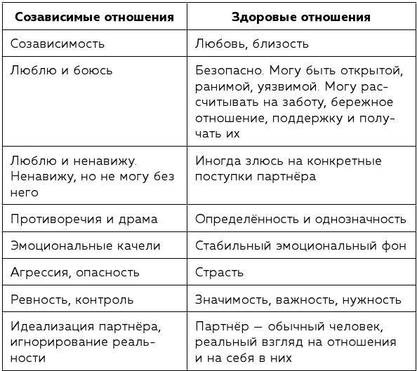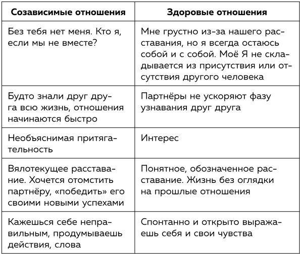 Другие причины этой боли мы разберем в следующих главах. Ниже вы найдете список признаков созависимых и здоровых отношений. Яркую черту последних очень точно сформулировала певица Софья Таюрская[11]: