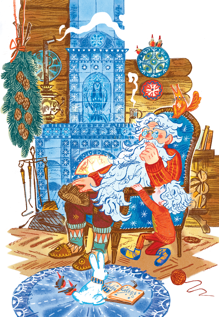 Но и у Дедушки Мороза были дела. Сейчас пришёл из леса с дровами, отряхнул снег с шапки и сел поближе к печке. Тут-то Мороз-младший на нём и повис.