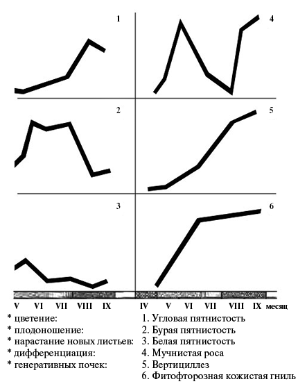 Следует отметить, что сама динамика развития основных грибных болезней в других регионах европейской части РФ и на Северном Кавказе существенно не отличается, хотя, несомненно, сроки весеннего возобновления и наступления минимальных и максимальных проявлений болезни зависят от климатической зоны и устойчивости к патогену генотипов.