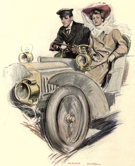 Mrs. Reynolds and Mrs. Miller having finished three sets, repaired to an isolated bench to enjoy a soda-lemonade and to cool off under the influences of a friendly chat. Mrs. Reynolds, who, as has been intimated, wore the breath of life in her nostrils, had got slightly the better of her adversary, and was inclined therefore to be on the alert, if not perky. Her ears were the first to detect the whir of an automobile, and she pricked them up. Then the toot of a horn fixed everyone's attention on the approaching monster, for automobiles were still more or less of a novelty, and engendered curiosity. In another instant a huge machine, of bridal white, as Mrs. Baxter subsequently described it, tore around the corner of the road, and, dashing past the occupants of the tennis courts, swept up to the ladies' entrance of the club-house, where it paused, snorting like a huge dragon. It was the largest and most imposing "bubble" which Westfield had gazed upon. Many of the spectators left their places to examine it, and everyone's head was turned in that direction.