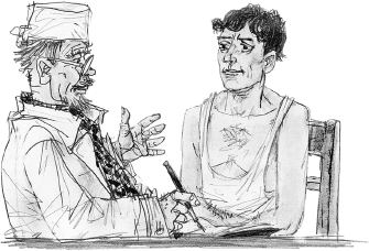 Он показывал пальцами на свой рот, мычал и не без страха поглядывал на свой стакан.