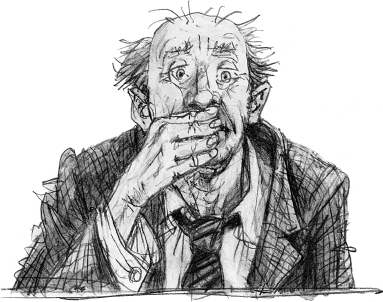 Но тут глаза его стали круглыми от удивления. Он охнул, подпрыгнул на своём стуле, открыл рот и, схватив салфетку, стал кашлять и плеваться.