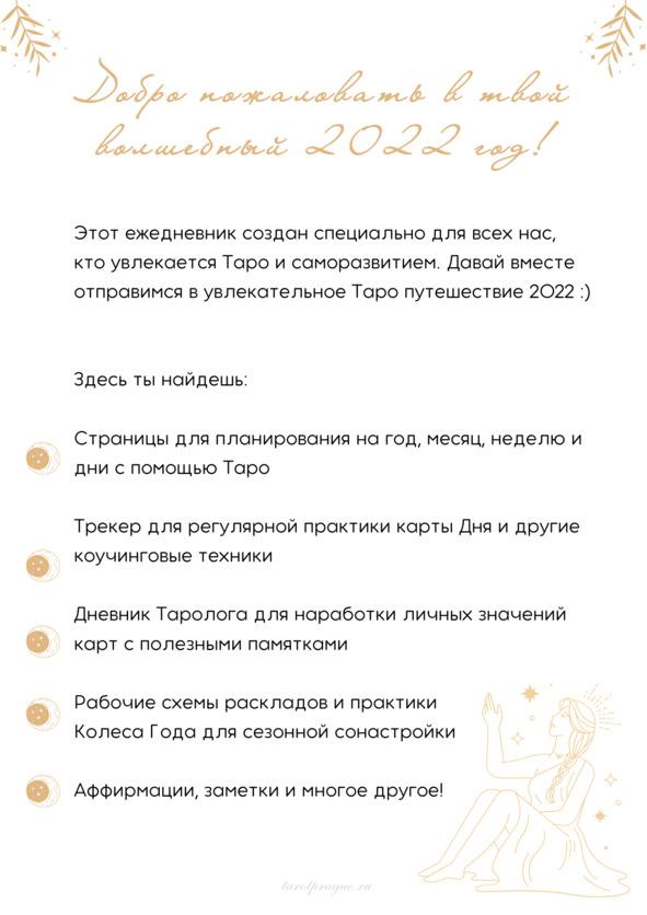 «Таро Ежедневник — 2022» — универсальный планер для всех, кто уже увлекается Таро или только планирует изучение. Здесь вы найдете все необходимое для записи раскладов Таро, значений карт, а также регулярной практики.
