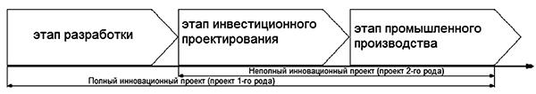 Все этапы инновационного цикла включают в себя так называемые полные инновационные проекты, их еще называют — инновационные проекты первого рода, а инновационные проекты второго рода, или неполные инновационные проекты состоят из двух последних этапов, или из одного этапа промышленного производства (см. рис. 1.1).