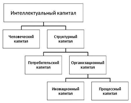 В приведенной схеме авторы отождествили человеческий капитал с компетенцией сотрудников в классификации Свейби. Эта часть не может быть собственностью компании. Под структурным капиталом понимается все, что имеет отношение к организации в целом — то, что имеется у фирмы, когда ее сотрудники находятся за пределами офиса. Это отношения с клиентами, включая договоры и контракты, и организационный капитал, представляющий из себя все активы фирмы, дающие возможность повысить эффективность ее работы, а также организационные способности, сопряженные с предоставлением услуг компанией или созданием продукта. Организационный капитал разделен на инновационный, состоящий по большей части из прав интеллектуальной собственности (патентов, лицензионных соглашений), а также процессный капитал, связанный с инфраструктурой компании (различные производственные, сбытовые, сервисные системы и т. п.).