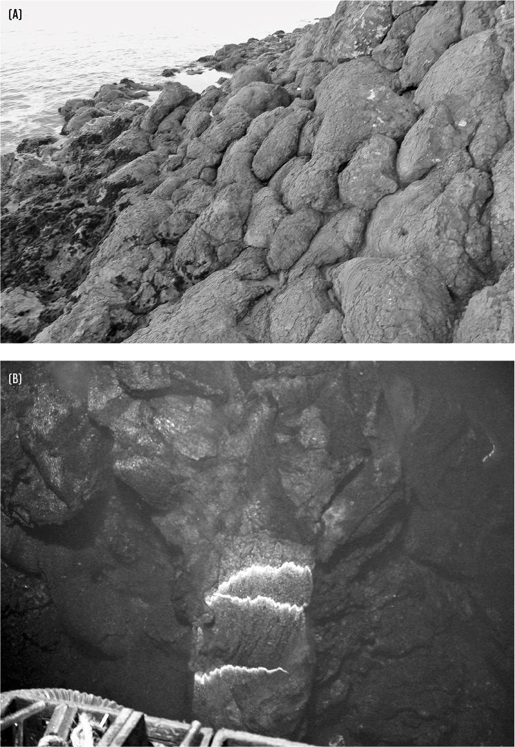 Рис. 2.3 (A) Подушечные лавы, образованные подводными извержениями, к западу от пирса поселка Порт-Сан-Луис (Калифорния). Фото автора. (B) Подушечные лавы, извергающиеся под водой. Источник: Wikimedia Сommons