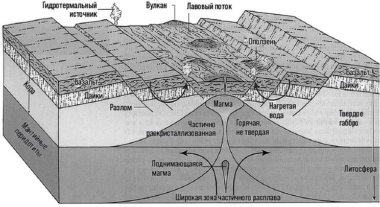 Рис. 2.5 Образование офиолитового комплекса в срединно-океанических хребтах. Составлено по нескольким источникам