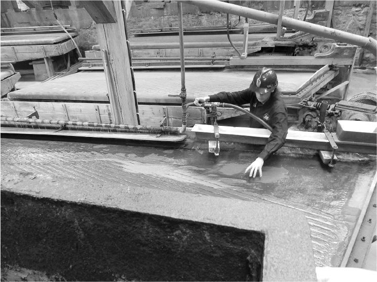 Рис. 3.4 Магнитный сепаратор на оловянной шахте Гивор. Рифление стола помогает отделить тяжелое олово и другие металлы от пустой породы. Магниты под столом концентрируют металлосодержащие минералы в верхней части стола, а безрудный материал стекает с его нижней части. Фото автора