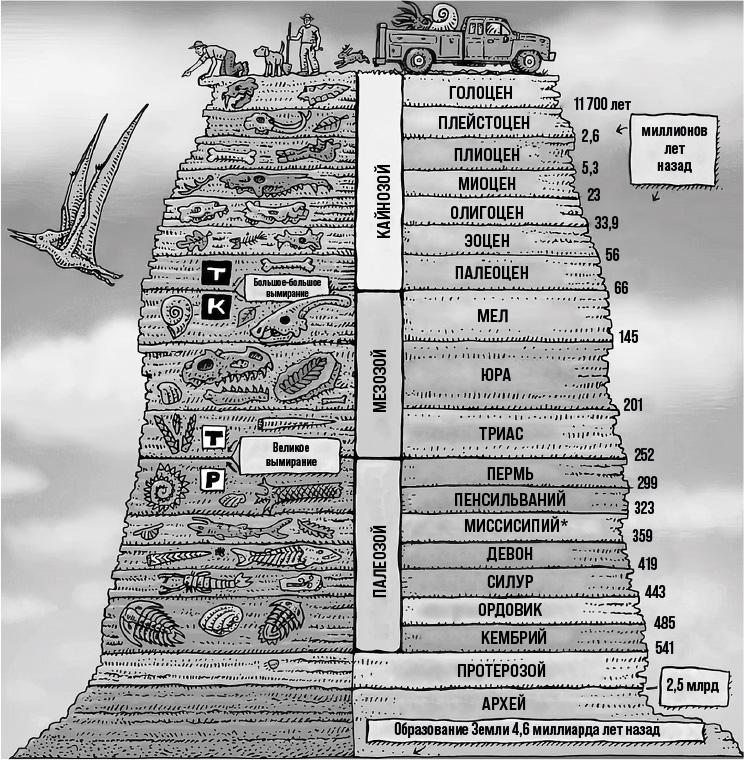 На рисунке выше отражены геологические эры (кайнозой, мезозой, палеозой, протерозой, архей) и входящие в них периоды. Однако кайнозой подразделяется здесь не не на периоды, а на эпохи (палеоцен, эоцен и т.д.), на которые периоды делятся. Общую стратиграфическую шкалу см. . — Прим. науч. ред.