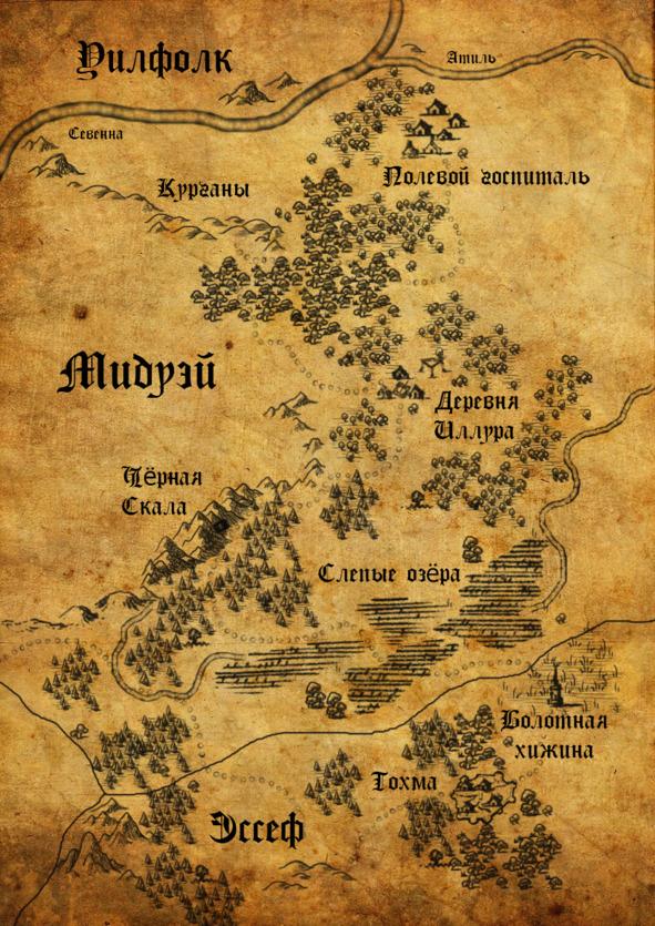 Забираясь всё глубже в бурелом, он понемногу отходил от шока последних минут, вместо полубезумной разноголосицы в голове начали всплывать вполне разумные вопросы. Первейший из них — открывшаяся кровоточащая рана, срочно требующая внимания. С трудом обходя очередное поваленное дерево, через которое не смог бы перелезть, Эйден всё же остановился. Переводя нерешительный, потерянный взгляд с окровавленной ноги на почти неприметные следы, оставленные им по пути сюда, решил передохнуть. Вероятность того, что пару неглубоких вмятин на сырой, слежавшийся листве или чуть стёртый лишайник на изогнутой ветке заметят преследователи — была невелика. А вот знакомая слабость от потери крови уже начинала проявляться. Тяжело опустившись на влажное от утренней росы бревно, он со сдавленным вздохом вытянул вперёд правую ногу. Половина штанины поблескивала влажно алым, и пошевелив пальцами в дырявом ботинке, Эйден почувствовал мерзкую, полусвернувшуюся массу. Стараясь не тревожить бедро, он аккуратно снял поношенную холщовую куртку. Прикинув, как нанести ей возможно меньше ущерба — оторвал длинную ленту шириной в ладонь. Поискал глазами вокруг себя, поднял и критически осмотрел пару палок. Вздохнув, покачал головой, откидывая их в сторону. Решил, что слишком тугая повязка помешает идти дальше. А идти было необходимо. Раз небесные дошли до лагеря, разбитого на самой границе Мидуэя — значит, основные силы Уилфолка не смогли оттеснить врага за Каменные броды. В противном случае, рыцари не решились бы заходить так глубоко в тыл противника. Или нет? Эйден плохо представлял себе, на что способны бывалые ветераны из дворян и их командиры. Однако, что они могут сотворить с беспомощным врагом — представлял невероятно ярко и отчётливо. И потому всем сердцем желал отгородиться от такой угрозы как можно большим количеством миль дикой, непролазной… особенно верхом, чащи мидуэйского леса. При этом вопрос выбора направления даже не стоял. Возвращаться назад в Уилфолк сейчас было не только опасно, но и бессмысленно. Даже если удалось бы добраться до позиций объединённых войск графства, его все равно вскоре отправили бы назад, кое-как подлатав ногу и всучив какую-нибудь потёртую пику или иззубренный меч. И все события последних месяцев повторились бы снова, только, вероятно, с худшим исходом…