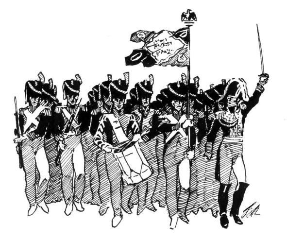 …Между прочим, («Les Marie-Louises») — шутливое прозвище солдат октябрьского набора 1813 г., состоявшего из 16-17-ти-летних мальчишек, прошедших только двухнедельную военную подготовку и сразу же брошенных на передовую. О начале их призыва объявила в Сенате императрица Мария-Луиза (отсюда и столь занимательное название). В результате удалось набрать 180 тыс. ополченцев Национальной гвардии первого разряда, избежавших зачисления в регулярную армию в основном по причине хрупкости телосложения (в этом кроется второй смысл прозвища, указывавший на «женственность» именуемых)…