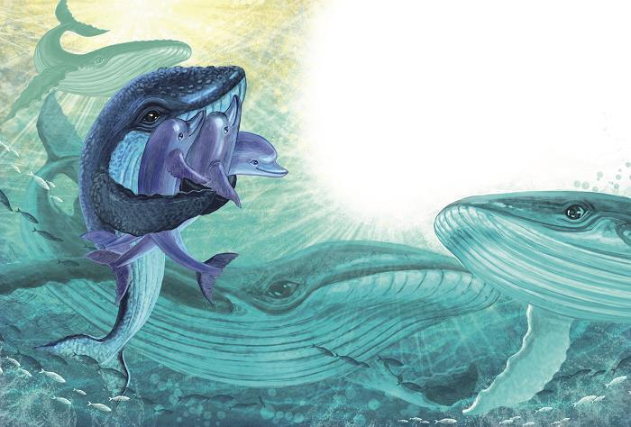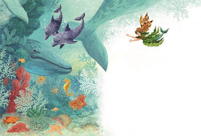 Э́мбре слы́шал, что снача́ла де́ти быва́ют о́чень ма́ленькими. Их прино́сят издалека́ морски́е черепа́хи. Они́ пря́чут младе́нцев под свои́ми огро́мными па́нцирями. И китёнок отпра́вился на другу́ю сто́рону лагу́ны.
