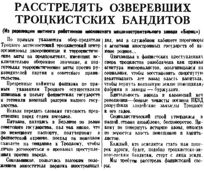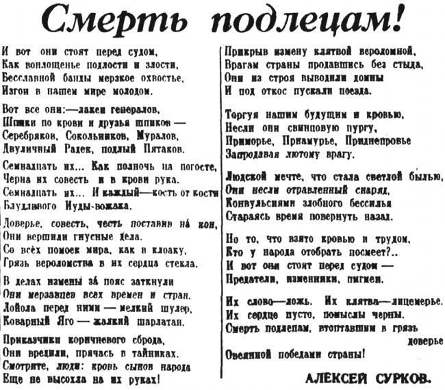 Все советские газеты сразу после начала процесса запестрели заголовками: «Шпионы и убийцы», «Торговцы Родиной», «Троцкист – вредитель – диверсант – шпион», «Подлейшие из подлых».