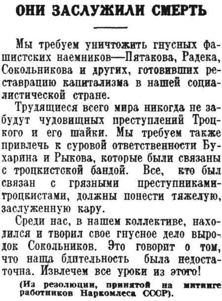 Газета «Правда» через четыре дня после начала московского процесса среди других истеричных требований смерти обвиняемых напечатала письмо, озаглавленное: «Мы требуем беспощадной расправы с подлыми изменниками нашей великой родины». Как и прочие подобные письма, оно не содержало никаких фактов, а было только наполнено бранью и угрозами. Письмо это подписали академики: химик А. Бах, растениевод Б. Келлер, геолог И. Губкин, паразитолог Е. Павловский, строитель локомотивов В. Образцов, физиолог А. Сперанский, математик М. Лаврентьев, эпидемиолог П. Здоровский. Они в один голос требовали: убить, раздавить, растоптать. Третьим по счету автором значился Николай Вавилов. Думал ли он, что почти ровно через шесть лет он сам, став «врагом народа», будет умирать на тюремной койке?