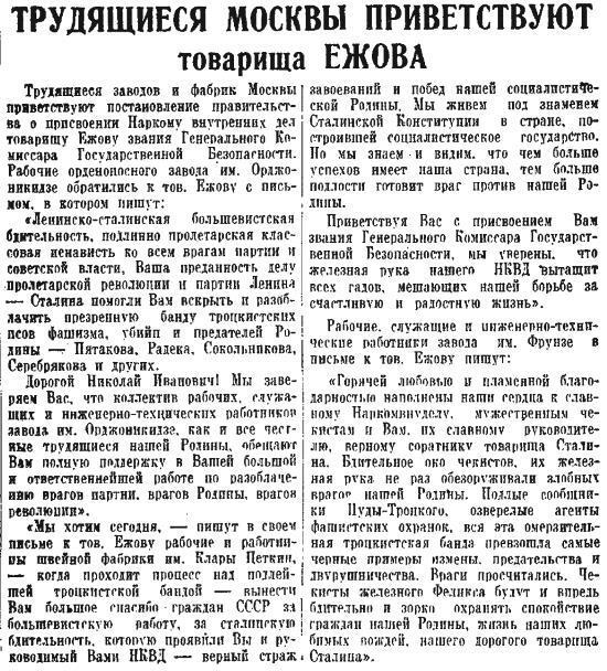 В архиве ЦК КПСС чудом сохранился документ от 28 января. Это – проект приговора по делу «Параллельного антисоветского троцкистского центра». Он был составлен председателем Военной коллегии Верховного суда СССР Ульрихом и адресован в ЦК ВКП(б) на имя Н.И. Ежова для согласования. Обращение высшего судебного органа в партийную инстанцию, более того, к наркому внутренних дел (по совместительству и секретарю ЦК), наглядно показывает, кто вершил правосудие. И, видимо, неслучайно, что в тот же день «Правда» опубликовала информацию о том, что Николаю Ежову присвоено звание генерального комиссара государственной безопасности.