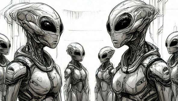 Командир группы Эбенов остановился в нескольких метрах от землян и протянул вперёд свои длинные пальцы, совершая жест, похожий на земное приветствие. Его взгляд был лишён эмоций, но в воздухе витало странное чувство спокойствия.