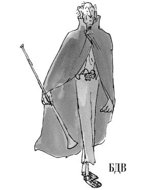 Софи, не помня себя от страха, всё-таки успела высунуть голову за край одеяла, свисавший между двумя углами, и оглядеться. Мимо неё проносились деревенские дома. Великан мчался по Хай-стрит так быстро, что его чёрный плащ раскинулся у него за спиной, словно птичьи крылья. Каждый его шаг был длиной с теннисный корт.