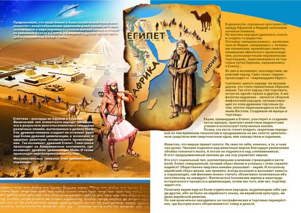 Египтяне — выходцы из Африки и Азии, физический тип египтянина сложился в результате многотысячелетнего смешения различных племён, вытесненных в долину Нила. Эти древние племена оседают на останках руин ещё более древней цивилизации, а возможно и ядерных реакторах космического происхождения. Так возникает древний Египет. Тоже самое происходит на Американском континенте, где возникает древняя цивилизация Майя. И также происходят жертвоприношение Солнцу. Монументальные символы этих цивилизаций — пирамиды.