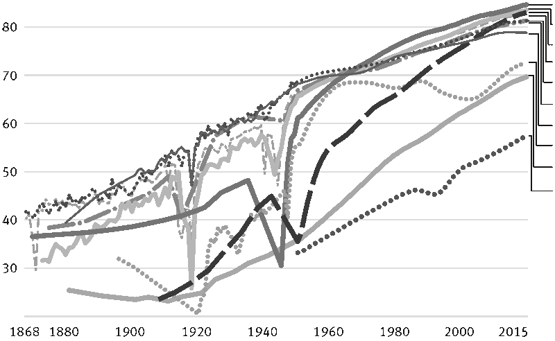 Ожидаемая продолжительность жизни при рождении, 1868–2015 гг. (среднее число лет, которое должен был бы прожить новорожденный, если бы структура смертности, зафиксированная на год его рождения, оставалась неизменной на протяжении всей его жизни)