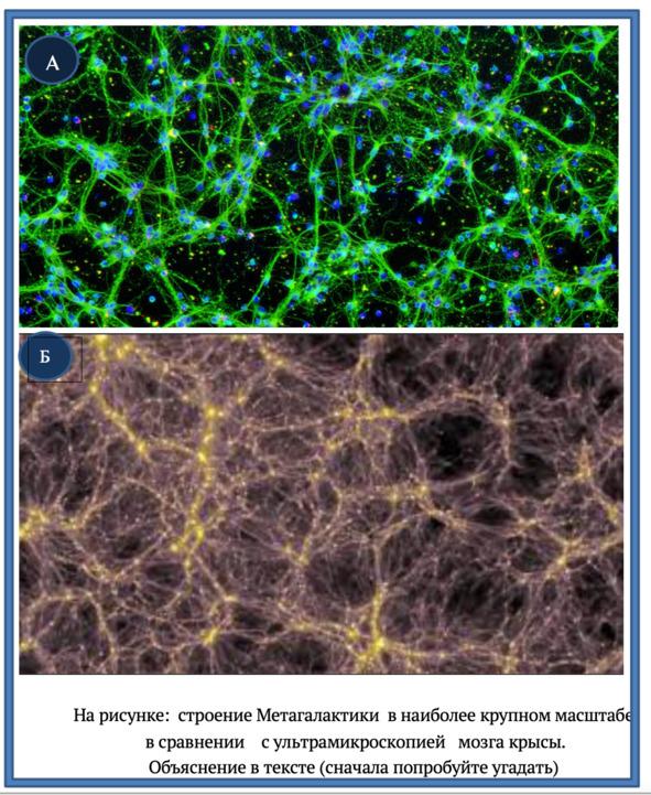 Любопытства ради, сравните стереоскопическую картину межнейронной сети головного мозга (на рисунке А) с изображением сложнейшей астрономической структуры Метагалактики (на рисунке Б), состоящей из миллиардов таких звёздных систем, как наш Млечный Путь. Вы увидите поразительное сходство этих двух объектов.