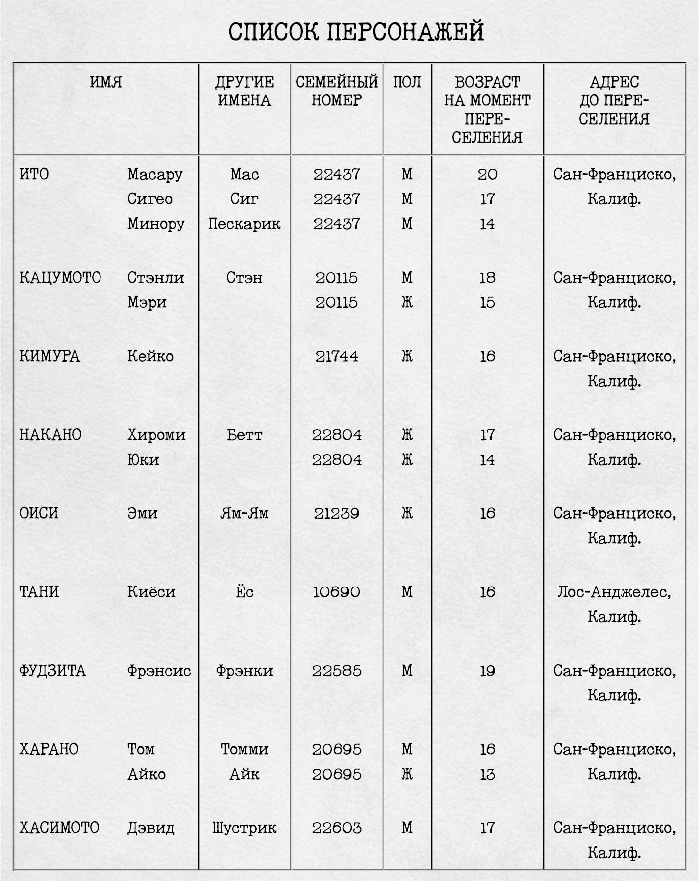 Наконец мы пересекаем Вебстер-стрит, и Мас опускает меня на ступеньки квартиры мистера Хидекавы. ФБР забрало мистера Хидекаву в ту же ночь, что и мистера Оиси. Мистер Хидекава был одним из старейшин нашей общины, во время Первой мировой он служил в армии, надеясь получить гражданство (не вышло). Когда он узнал, что за ним едут, то вытащил свои военные мундир и брюки, начистил ботинки и встретил ФБР в дверях, в форме ветерана армии США.