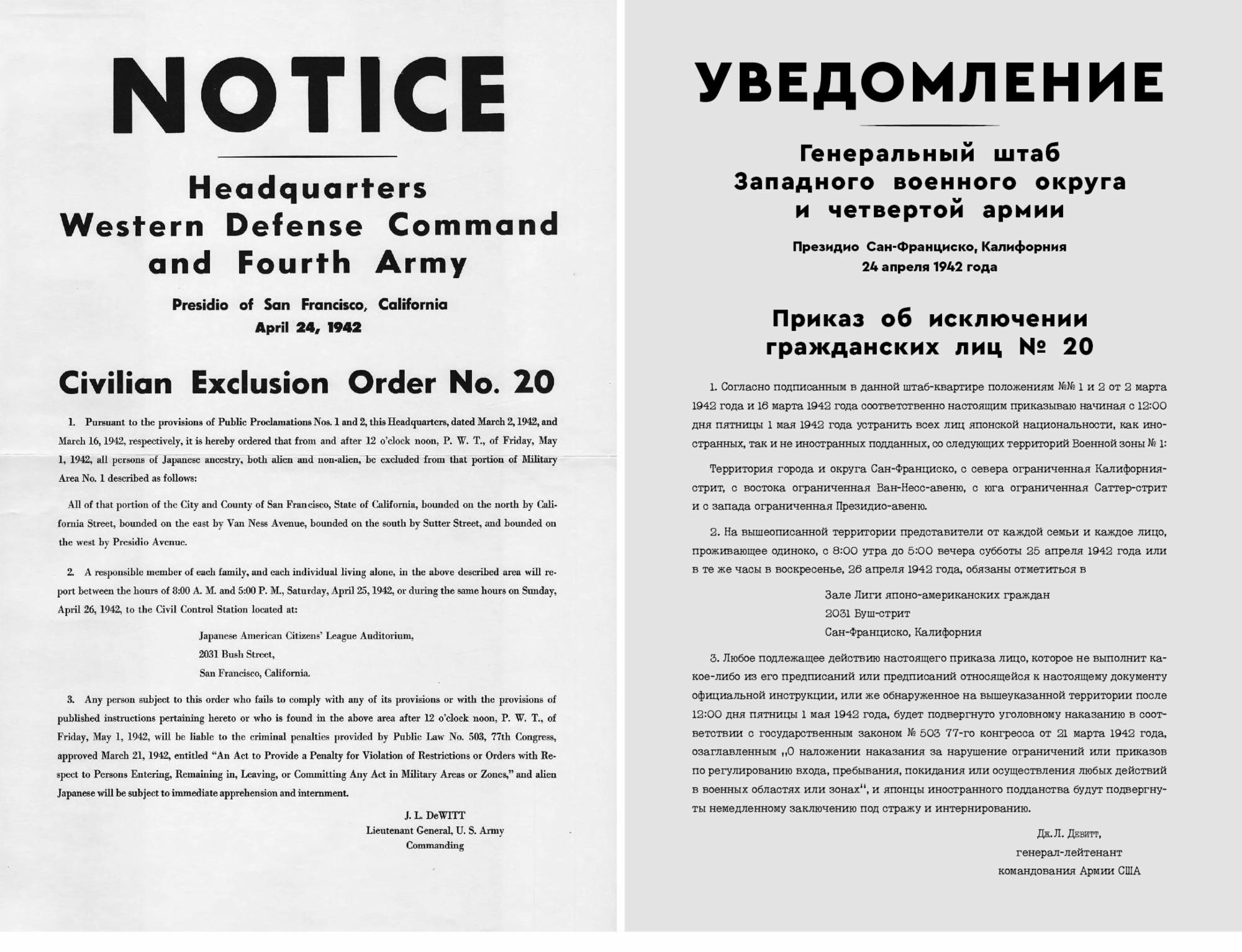 «Штат Калифорния, [Приказ об исключении гражданских лиц № 20], северо-восточная часть города Сан-Франциско», 24 апреля 1942 (“State of California, [Civilian Exclusion Order No. 20], City of San Francisco, northeast”, April 24, 1942, by J. L. DeWitt, Lieutenant General, U. S. Army, Western Defense Command and Fourth Army. Courtesy of the San Jose State University Department of Special Collections and Archives, John M. Flaherty Collection of Japanese Internment Records).