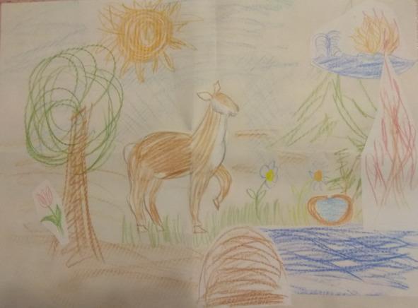 Эта сказка написана во время прохождения курса «Кружево волшебных сказок». Очень беспокоила боль в позвоночнике после перенесённого заболевания. Мечтала её снизить, совсем избавиться. Необычного в написании сказки было то, что Наталья Михайловна предложила по ходу написания сказки сделать коллаж из своих рисунков. Вот такой он у меня получился.