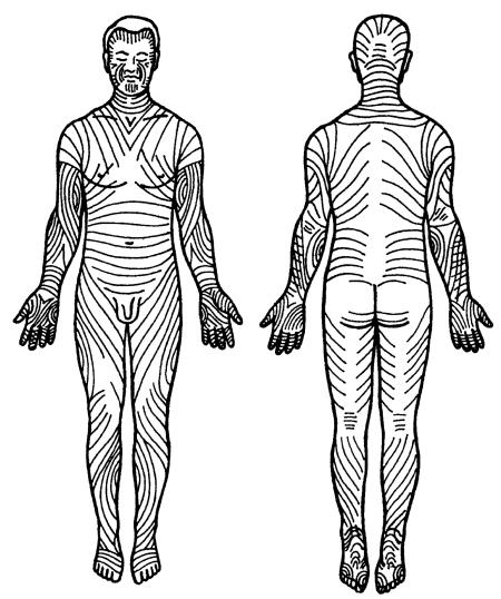 ✓ соединительнотканный – воздействуют в основном на соединительную ткань, подкожную клетчатку; основные приемы соединительнотканного массажа проводят с учетом направления линий Беннингофа (рис. 2);