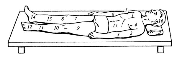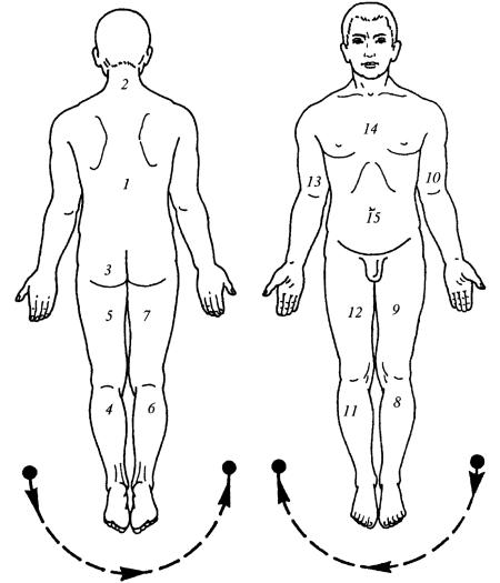 Рис 8 Последовательность проведения общего сеанса классического массажа 1 – спина, 2– шея, 3– таз, 4, 6– стопа, голень (по задней поверхности), 5, 7– бедро (по задней поверхности), 8, 11– стопа, голень (по передней поверхности) 9, 12 – бедро (по передней поверхности) 10– левая рука, 13 – правая рука, 14 – грудная клетка спереди, 15 – живот