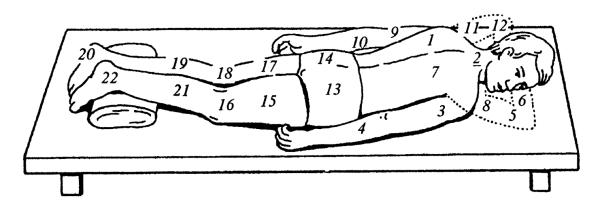 При общем тренировочном массаже спортсмена массируют в определенной последовательности (рис. 4). Продолжительность ручного массажа отдельных областей и частей тела примерно следующая: спины, шеи, надплечья, ягодичной (поясничной) области – 8 мин; бедер, коленных суставов, голеней, голеностопных суставов, стоп– 16 мин; плеча, локтевых суставов, предплечий, лучезапястных суставов, кистей, пальцев – 14 мин; груди, живота – 7 мин.