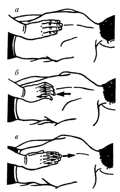 Рис. 15 Прямолинейное растирание подушечками пальцев: а – в – последовательность выпотения приема