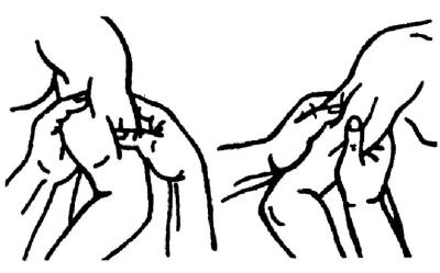 Вспомогательные приемы поглаживания. Щипцеобразное – выполняется щипцеобразно сложенными пальцами, чаще I–II–III или только I–II пальцами, при массаже пальцев кисти, стопы, сухожилий, небольших мышечных групп, лица, ушных раковин, носа (рис. 12).