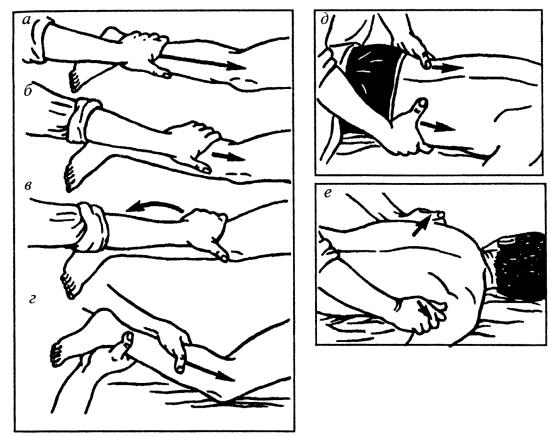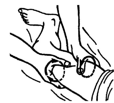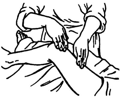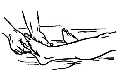 При нарушении кровообращения (припухлости, отеке) все поглаживания следует проводить по отсасывающей методике, т. е. начинать с находящихся выше участков, например, при патологическом процессе в голеностопном суставе – с бедра, затем массировать голень и только потом голеностопный сустав, все движения – по направлению к паховому лимфатическому узлу.