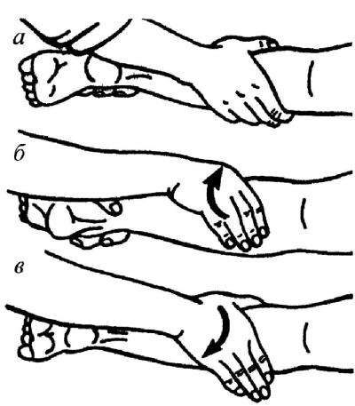 Рис. 25. Поперечное рашинание одной рукой: а – фаза фиксации; б – фаза сдавления: в – раздавливание (раскатывание)