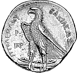 Сначала Птолемей попытался отчеканить несколько монет с именами юных царей, но быстро отказался от этого эксперимента. На аверсе монет, отчеканенных позднее, но все еще в тот период, когда Птолемей был сатрапом Египта, изображен профиль Александра Македонского, на плечи которого накинута шкура слона или льва, а на реверсе – Зевс или Афина, стоящие напротив орла или корабля. Став царем, сын Лага приказал поменять изображения на монетах. Теперь на аверсе изображался его собственный профиль с диадемой на голове и эгидой на плечах, а на реверсе, внутри окантовки из слов «Царь Птолемей», помещалось изображение орла, стоящего на молнии, – своего рода семейный герб. Монеты чеканились в самом Египте, на Кипре, в Малой Азии, в Финикии и Киренаике. Стандарт варьировался от аттического до родосского, от родосского до финикийского. Птолемей успел поэкспериментировать с пятью разными типами золотой и серебряной монетной чеканки. Эти деньги охотно принимали по всему бассейну Эгейского моря – их вес соответствовал стандарту, а в чистоте металла никто не сомневался.