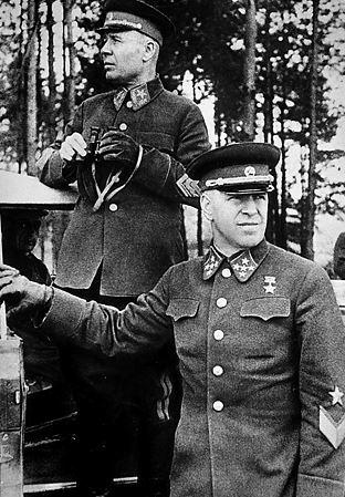Маршал Советского Союза Семен Тимошенко (слева) и генерал Георгий Жуков (справа) на учениях войск Киевского особого военного округа. 1940 г.