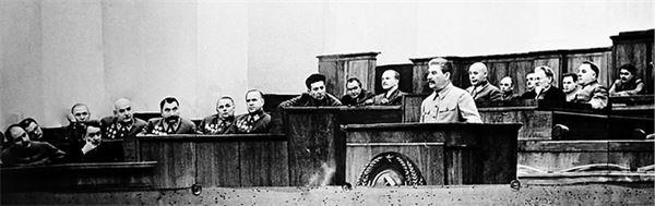 Климент Ворошилов, Михаил Калинин, Анастас Микоян, Андрей Андреев, Александр Щербаков, Георгий Маленков, Семен Тимошенко, Георгий Жуков, Андрей Еременко, Семен Буденный, Николай Булганин, Лазарь Каганович и другие в президиуме торжественного заседания, посвященного выпуску командиров, окончивших военные академии. Выступает Иосиф Сталин. Май 1941-го.