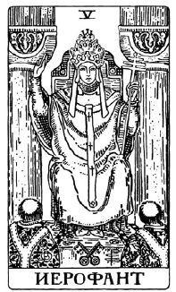 Пятый Старший Аркан – Папа, Папа Римский, Священник, Иерофант. В своей практике я использую название «Папа». Карта символизирует высшую церковную власть, духовность и христианскую мораль. Папа – антагонист Жрицы; миссионерство и несение своей доктрины и христианского знания противостоит эзотеризму и закрытости знания Жрицы. Карта указывает на духовного наставника, учителя как одного из столпов общества, общественное знание и церковные, духовные ценности.
