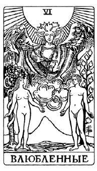 Главное значение карты, берущее свое начало из ранних колод Таро, – выбор: между двумя путями, работами, партнерами, решениями и так далее. Карта Влюбленные зачастую говорит, с одной стороны, о заманчивости одного из путей и реальности, но с трудностями – с другой. И выражает сомнения вопрошающего, который находится на перепутье. Также эта карта символизирует общение, советы и влияние разных людей на важное для вопрошающего дело или решение.