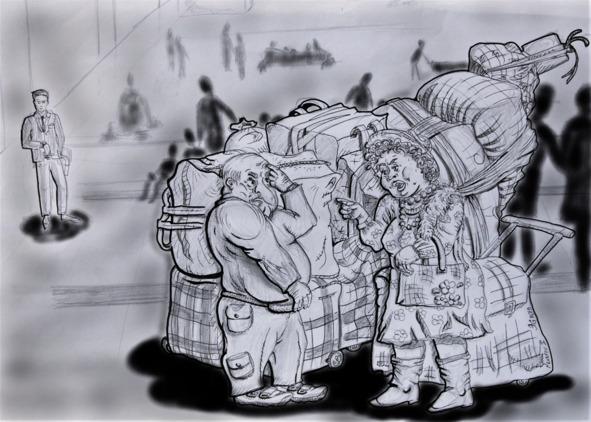 Внезапно его взгляд привлекла пожилая пара, перетаскивающая полосатые тюки, перемотанные коричневым скотчем. Полноватая женщина с темными кудрявыми волосами под соломенной шляпкой, одетая в цветастое, не по-осеннему легкое платье, клеймила тянущего неподъемный груз лысого коротышку. Ее маленькие, глубоко посаженные глазки сверлили безволосую голову старика. А он лишь пыхтел и вытирал платком лицо, которое с каждой секундой становилось — то ли от усердия, то ли от гнева — все краснее и краснее. В конце концов ему это все надоело: он остановился. Женщина тут же подошла к нему, ткнула в бок и с укором воскликнула: